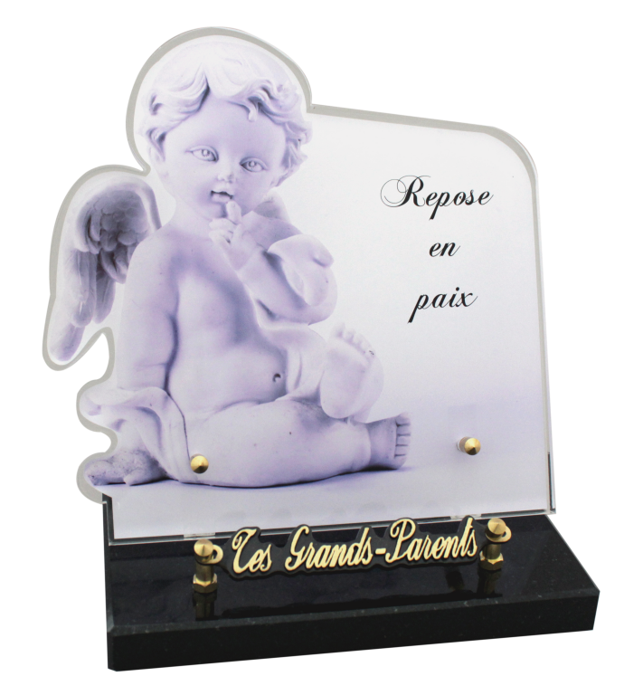 photo découpée. PMMA 10mm impression HD avec ou sans texte. Décor protégé par lamination. Socle granit sur tampons silicone.