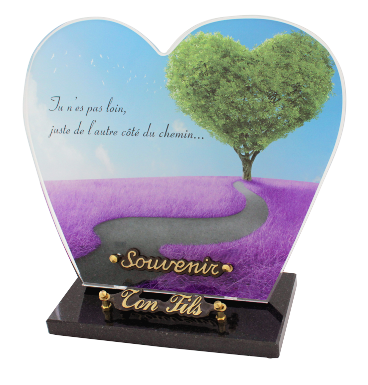 photo découpée. PMMA 10mm impression HD avec ou sans texte. Décor protégé par lamination. Socle granit sur tampons silicone.