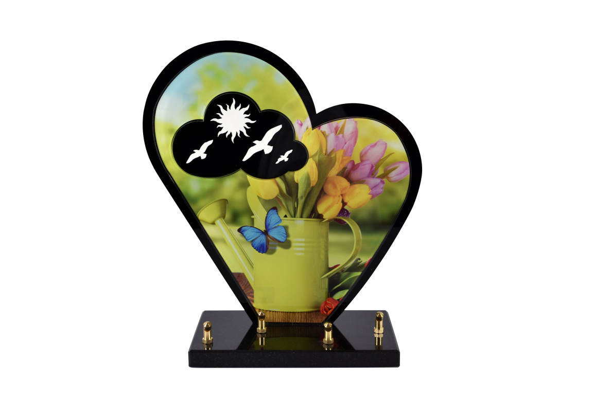 Coeur découpé PMMA 2 épaisseurs. Fond découpé Noir opaque. Décor impression numérique HD sur PMMA 6 mm. 2 INTERS