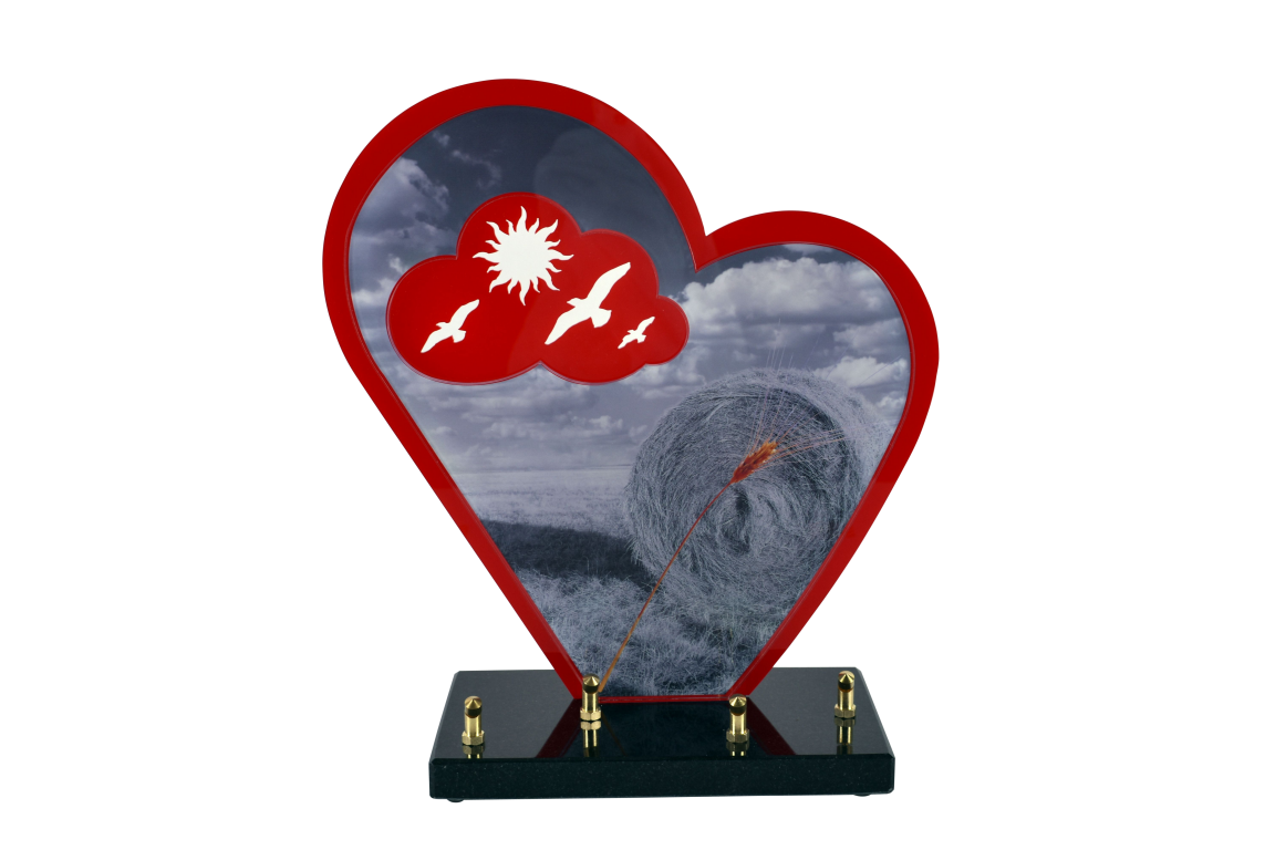 Coeur découpé PMMA 2 épaisseurs. Fond découpé Rouge opaque. Décor impression numérique HD sur PMMA 6 mm. 2 INTERS