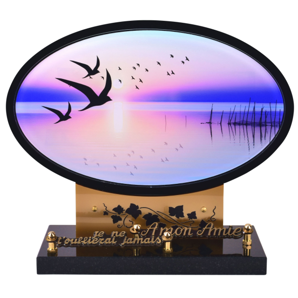2 INTERS. PMMA noir 8mm + décor impréssion numérique HD 6mm + décor feuillage PMMA 3mm doré + socle granit noir sur tampons silicone