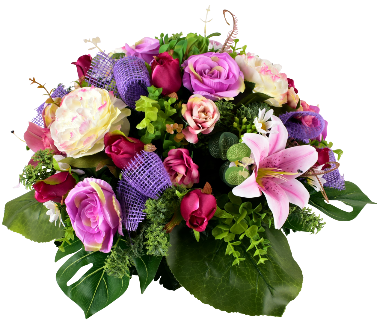 Pivoine, gardénia, echeveria, cyprès, ruban