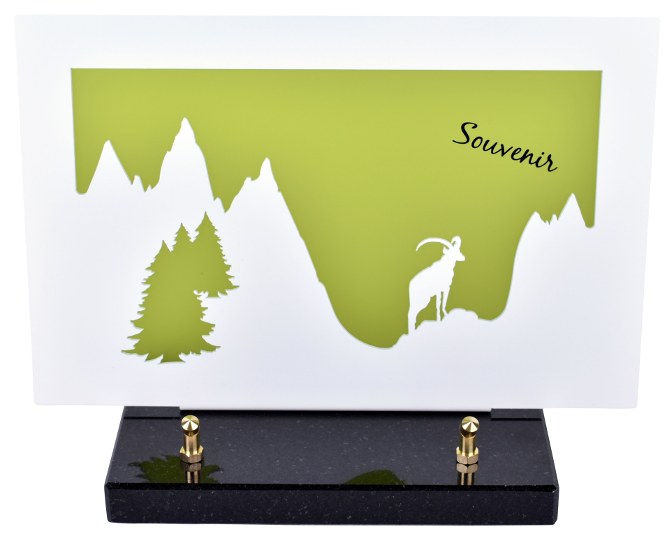 Plaque Inox poudré 2MM + PMMA 3 MM avec ou sans texte. Socle granit sur tampons silicone.