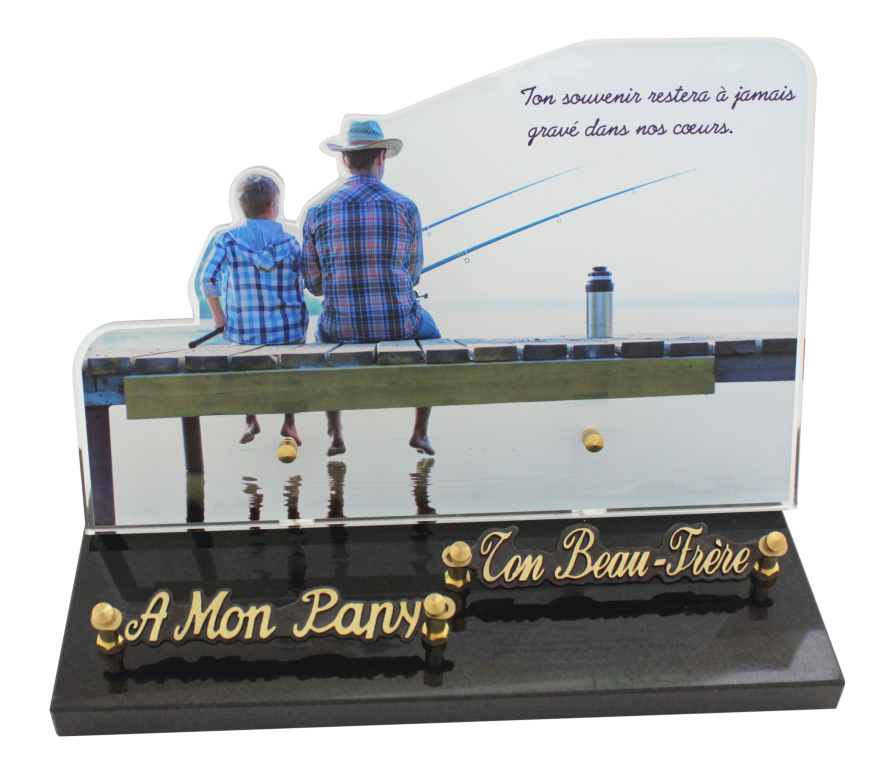 photo découpée. PMMA 10mm impression HD avec ou sans texte. Décor protégé par lamination. Socle granit sur tampons silicone.