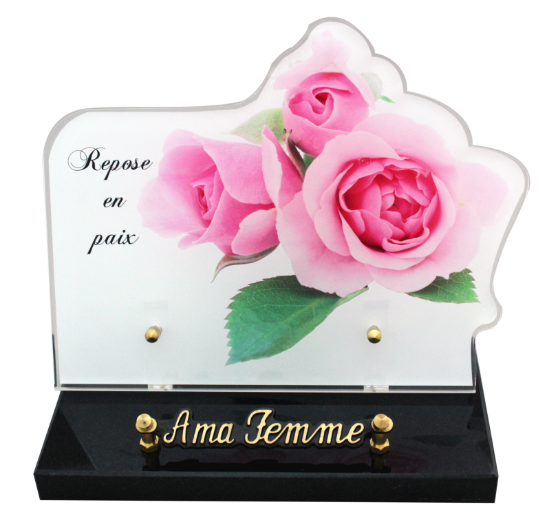 photo découpée. PMMA 10mm impression HD avec ou sans texte. Décor protégé par lamination. Socle granit sur tampons silicone.