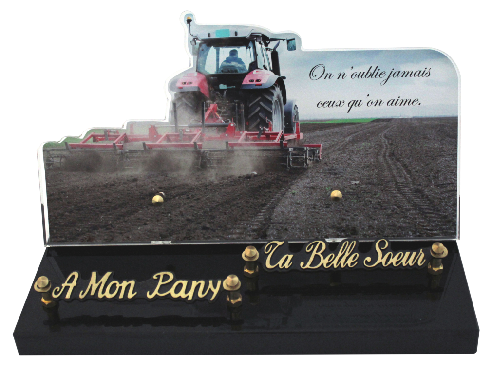 photo découpée. PMMA 10mm impression HD avec ou sans texte. Décor protégé par lamination. Socle granit sur tampons silicone.