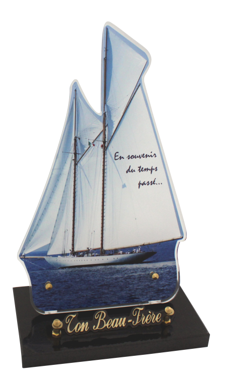 photo découpée. PMMA 10mm impression HD avec ou sans texte. Décor protégé par lamination. Socle granit sur tampons silicone.